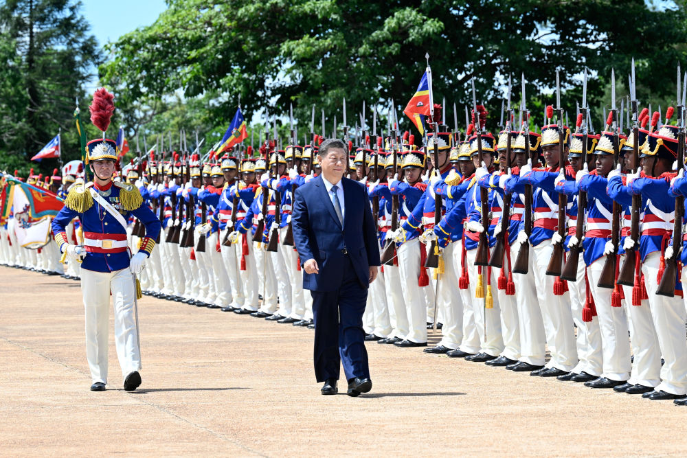 軍樂團奏中巴兩國國歌。兩國元首一同觀看儀仗隊分列式。中巴兒童揮舞兩國國旗熱烈歡迎習近平。巴西藝術家用中文演唱《我的祖國》。