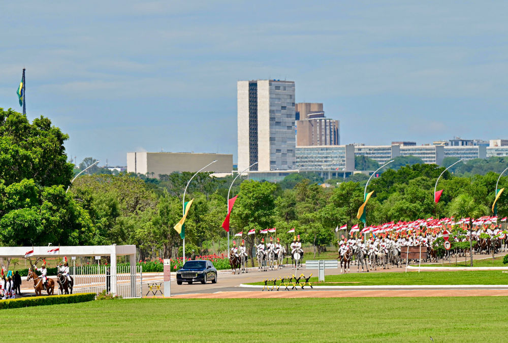 初夏時節的巴西利亞,天朗氣清。黎明宮內,綠草如茵,450名威武禮兵整齊列隊。在120名龍騎兵護衛下,習近平乘車抵達黎明宮前廣場。