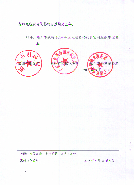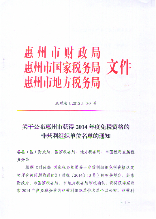 關于公布惠州市獲得2014年度兌稅資格的非營利組織單位名單的通知