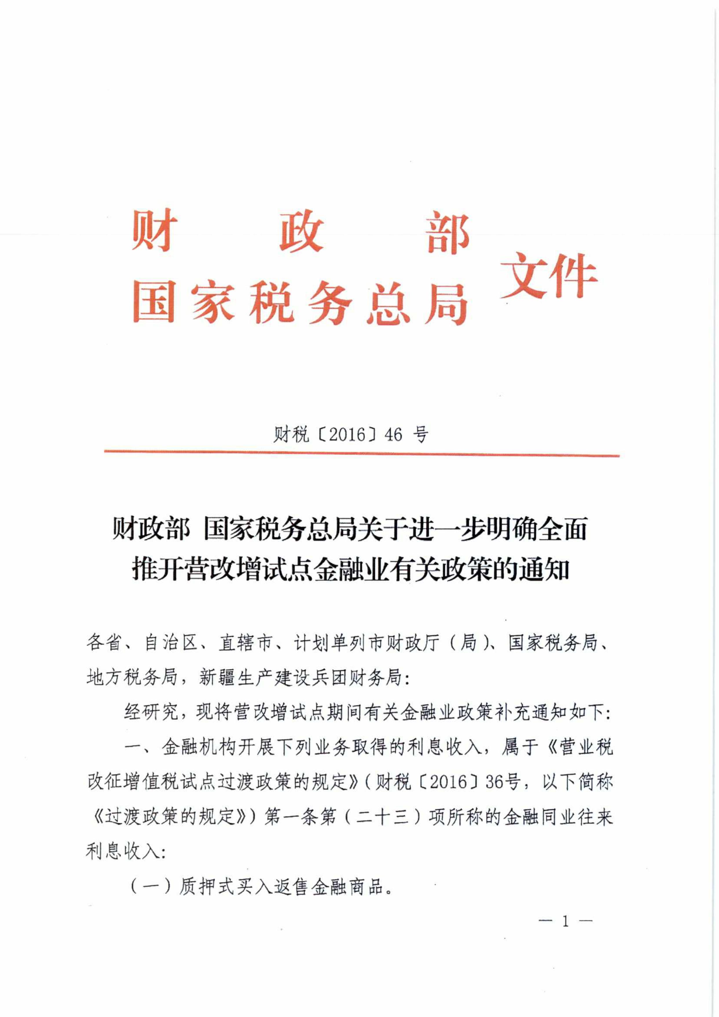 財政部 國家稅務總局關于進一步明確全面推開營改增試點金融業有關政策的通知