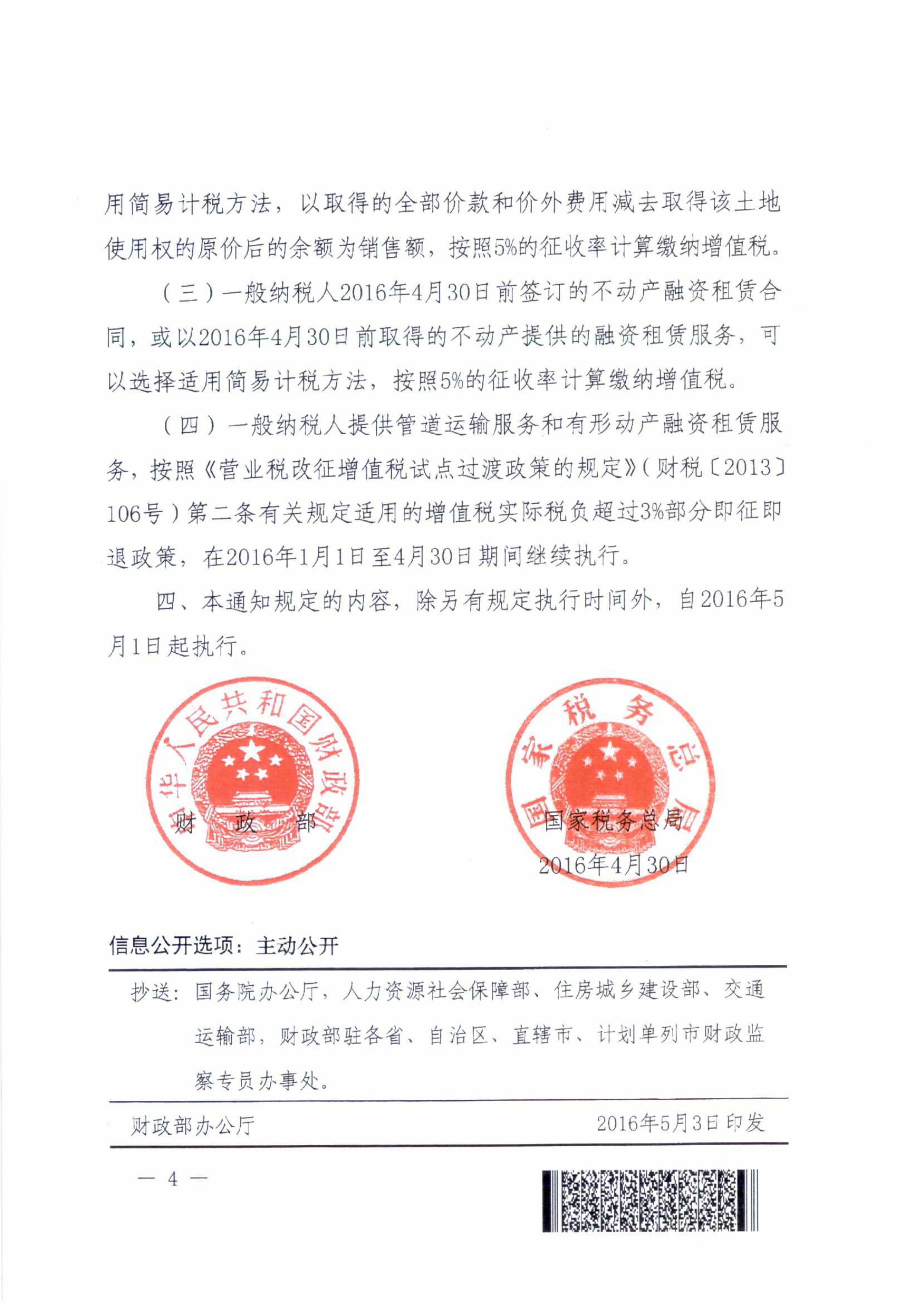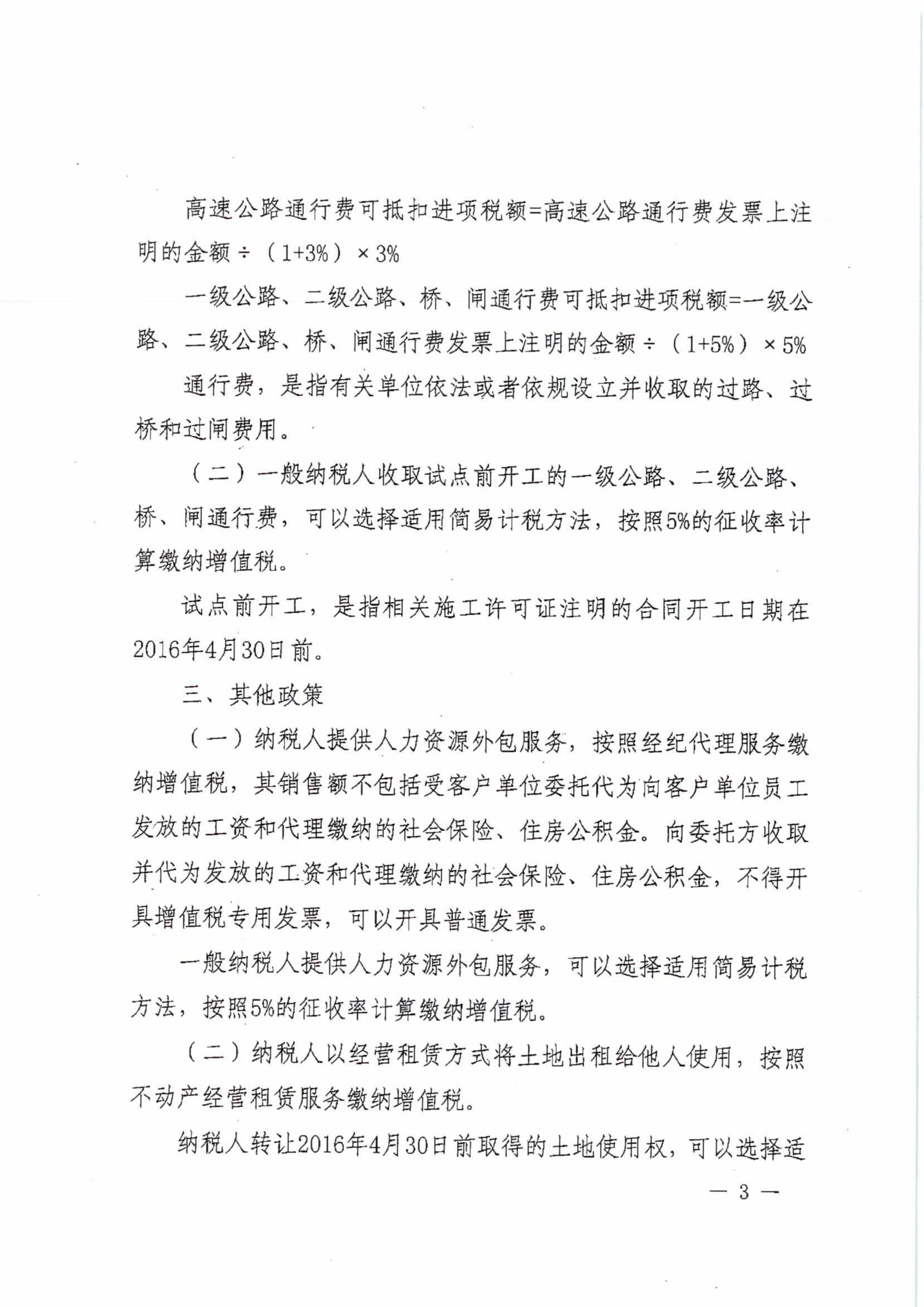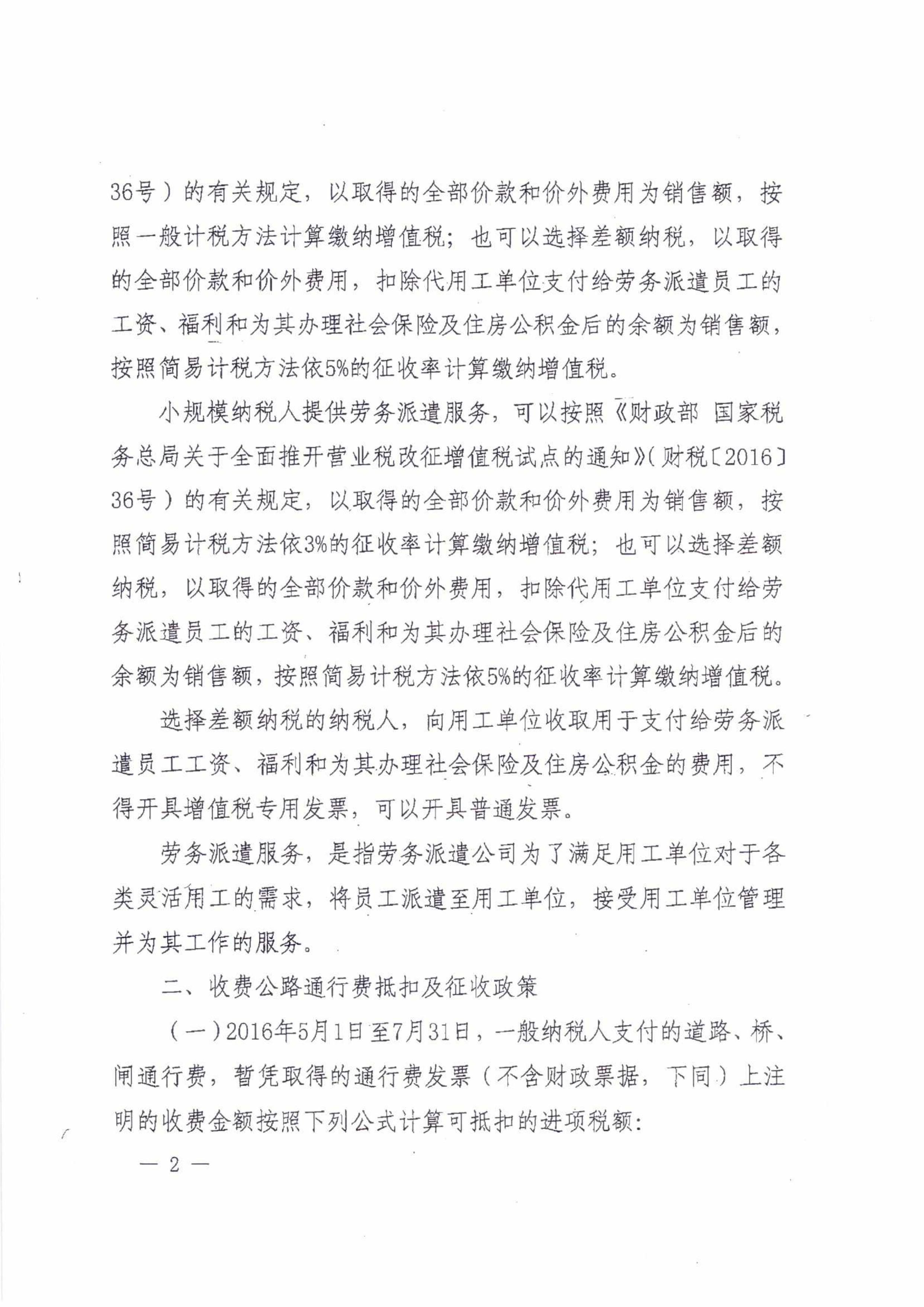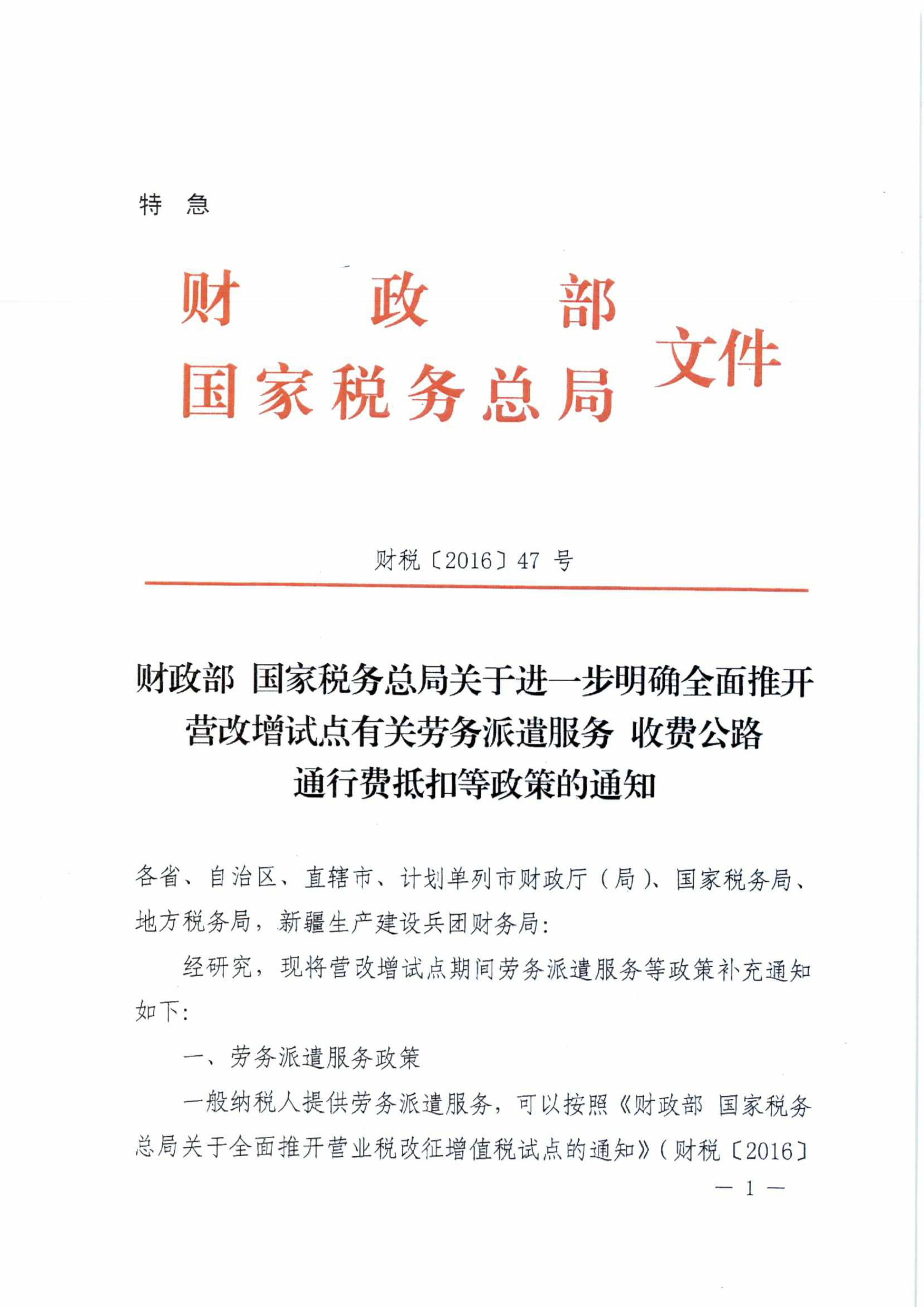 財政部 國家稅務總局關于進一步明確全面推開營改增試點有關勞務派遣服務 收費公路通行費抵扣等政策的通知