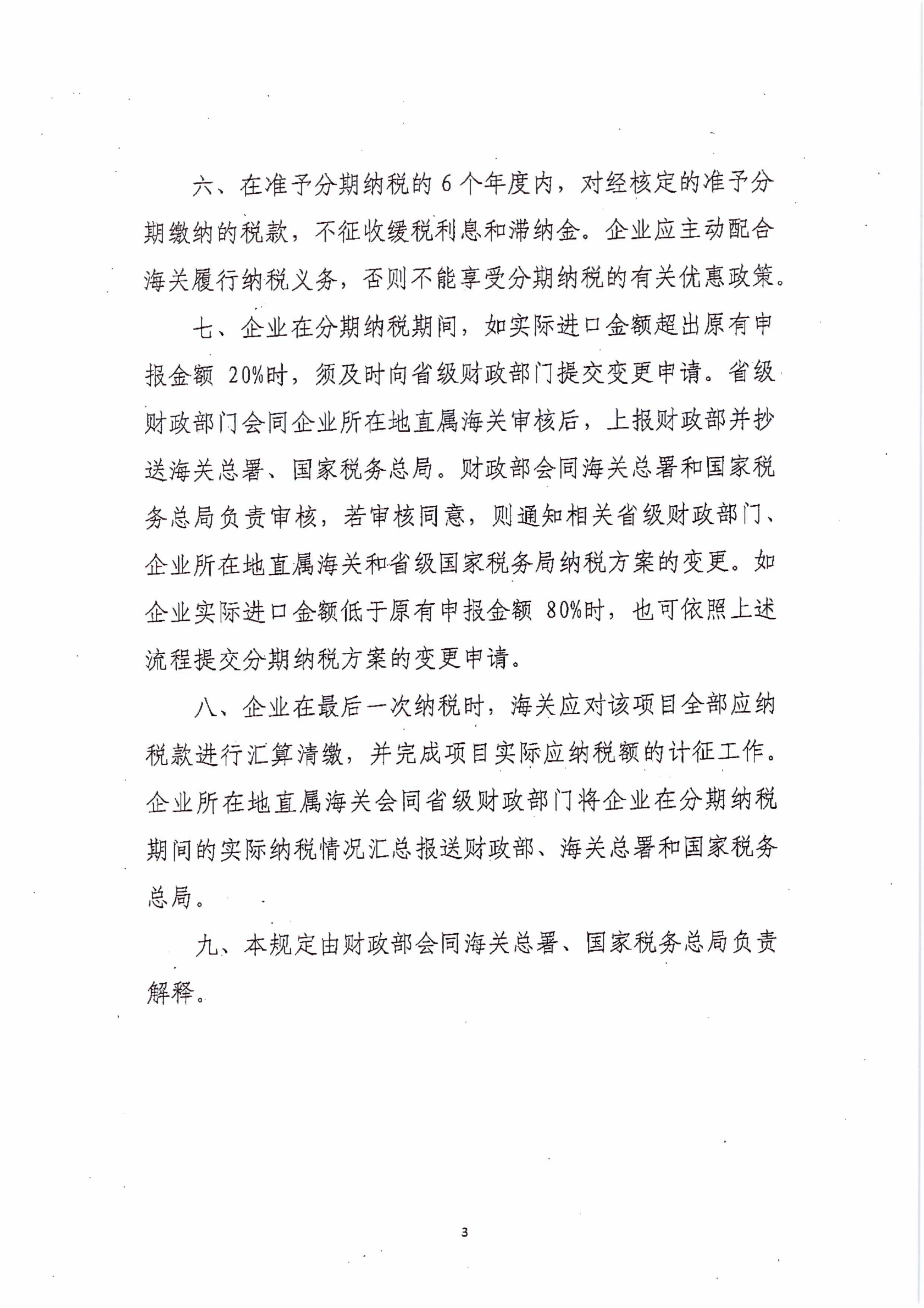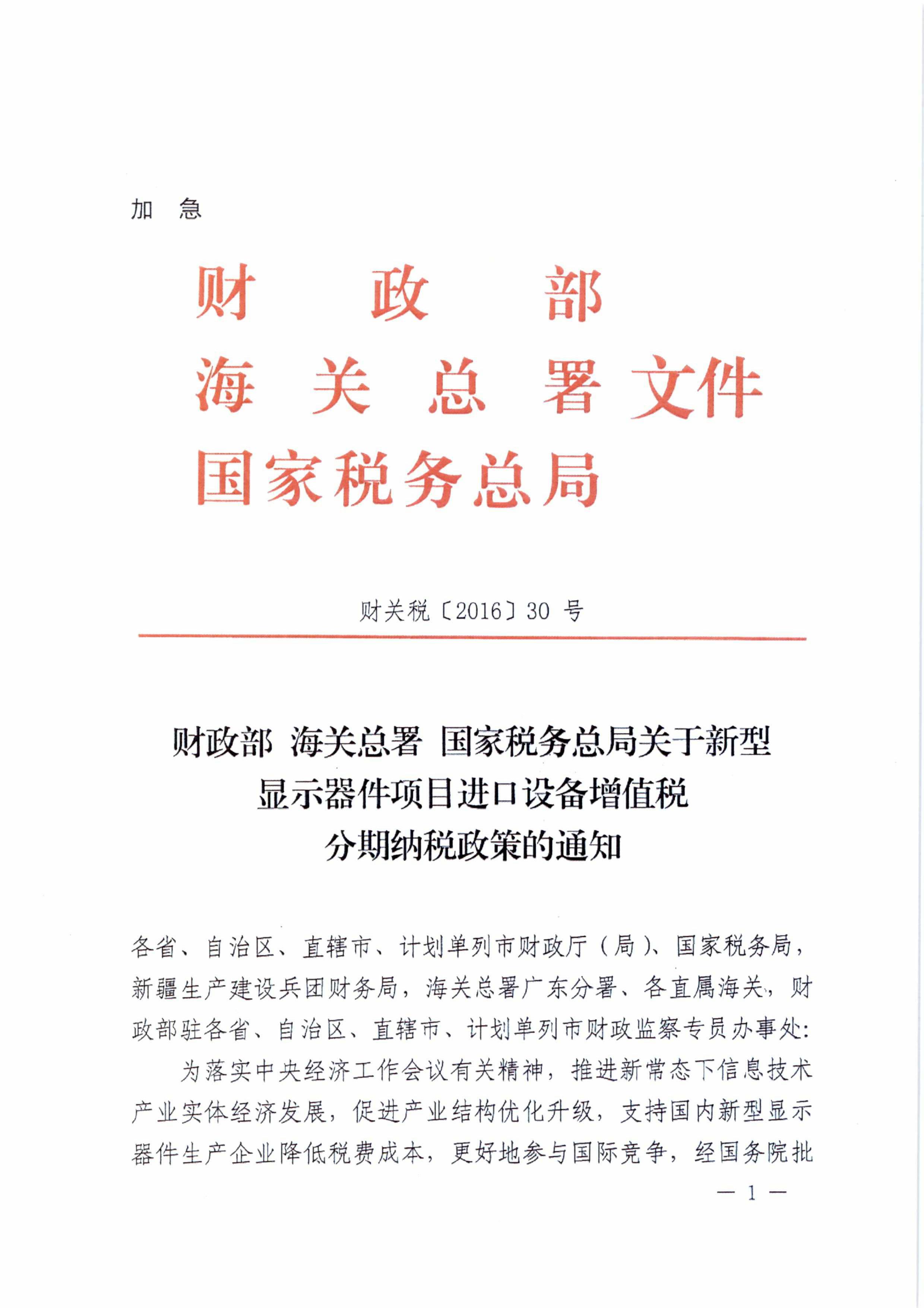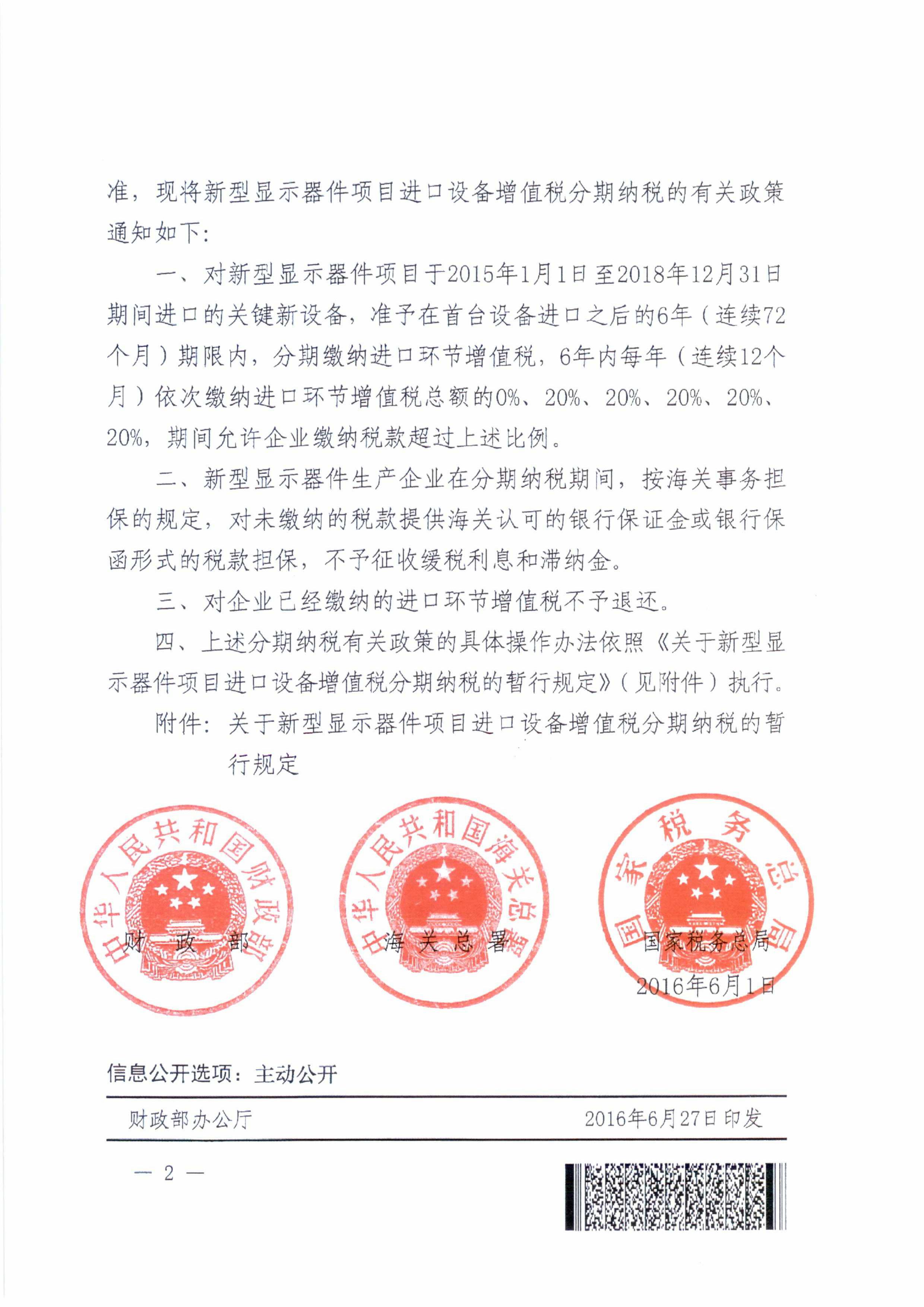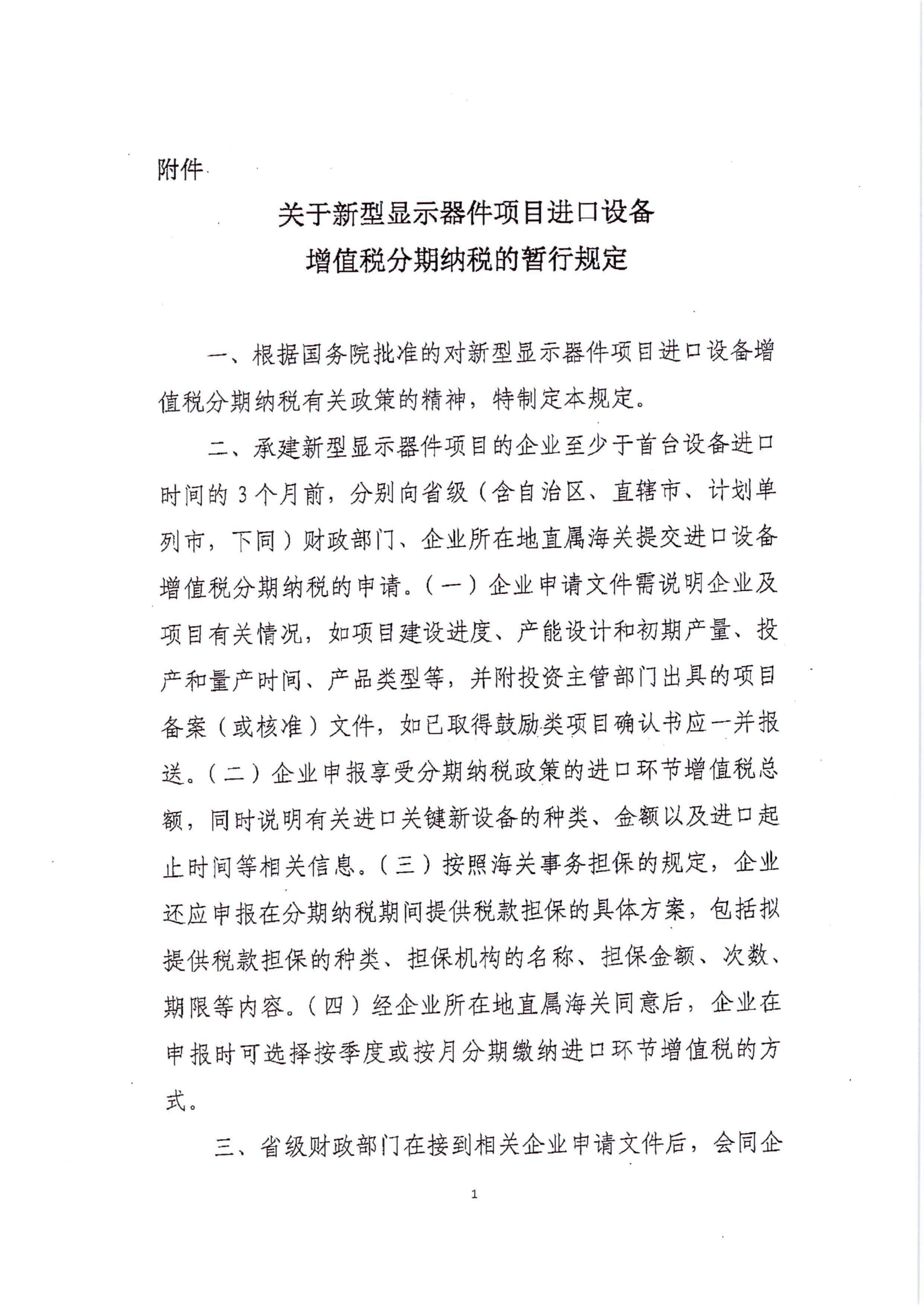 財政部 海關總署 國家稅務總局關于新型顯示器件項目進口設備增值稅分期納稅政策的通知