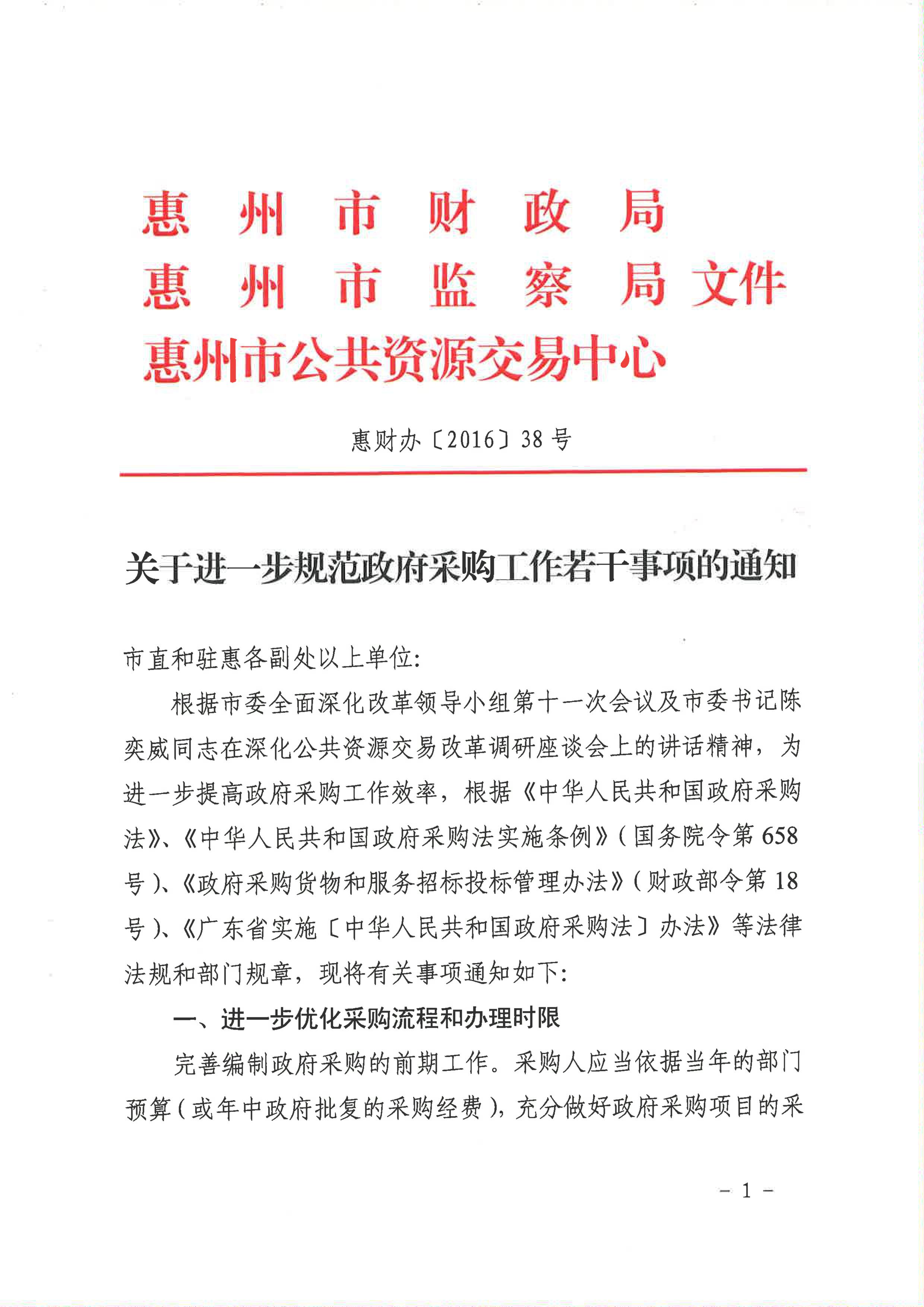 (惠財辦〔2016〕38號)關(guān)于進一步規(guī)范政府采購工作若干事項的通知