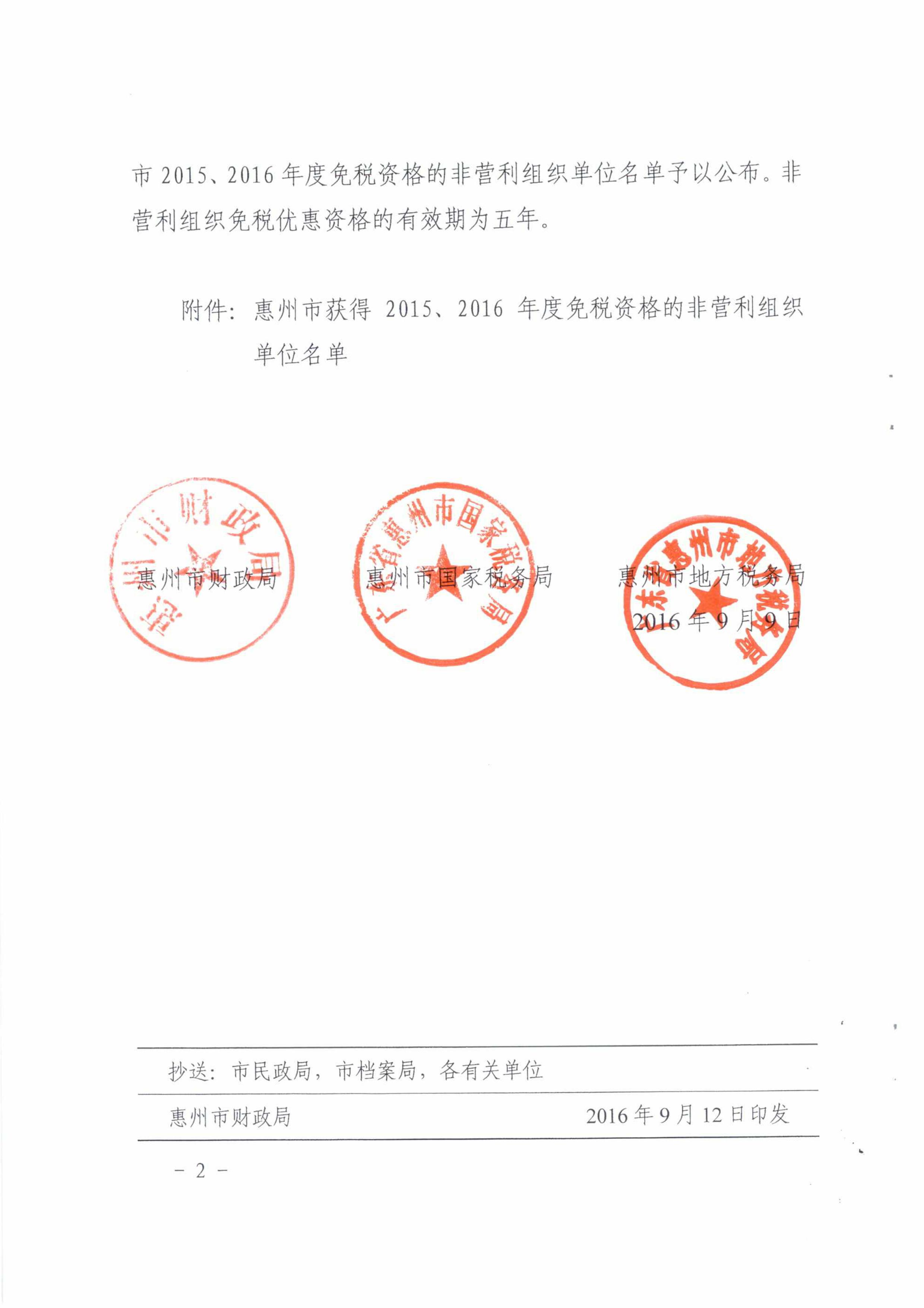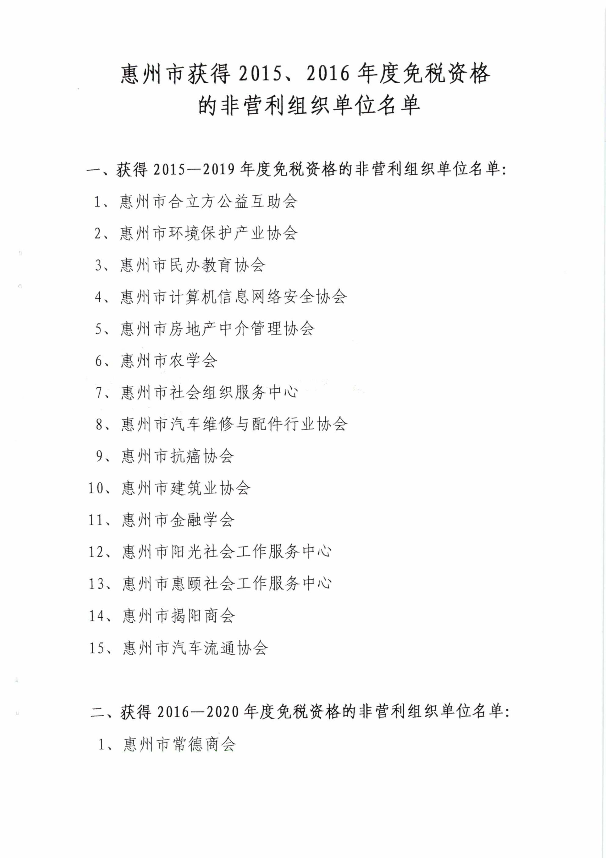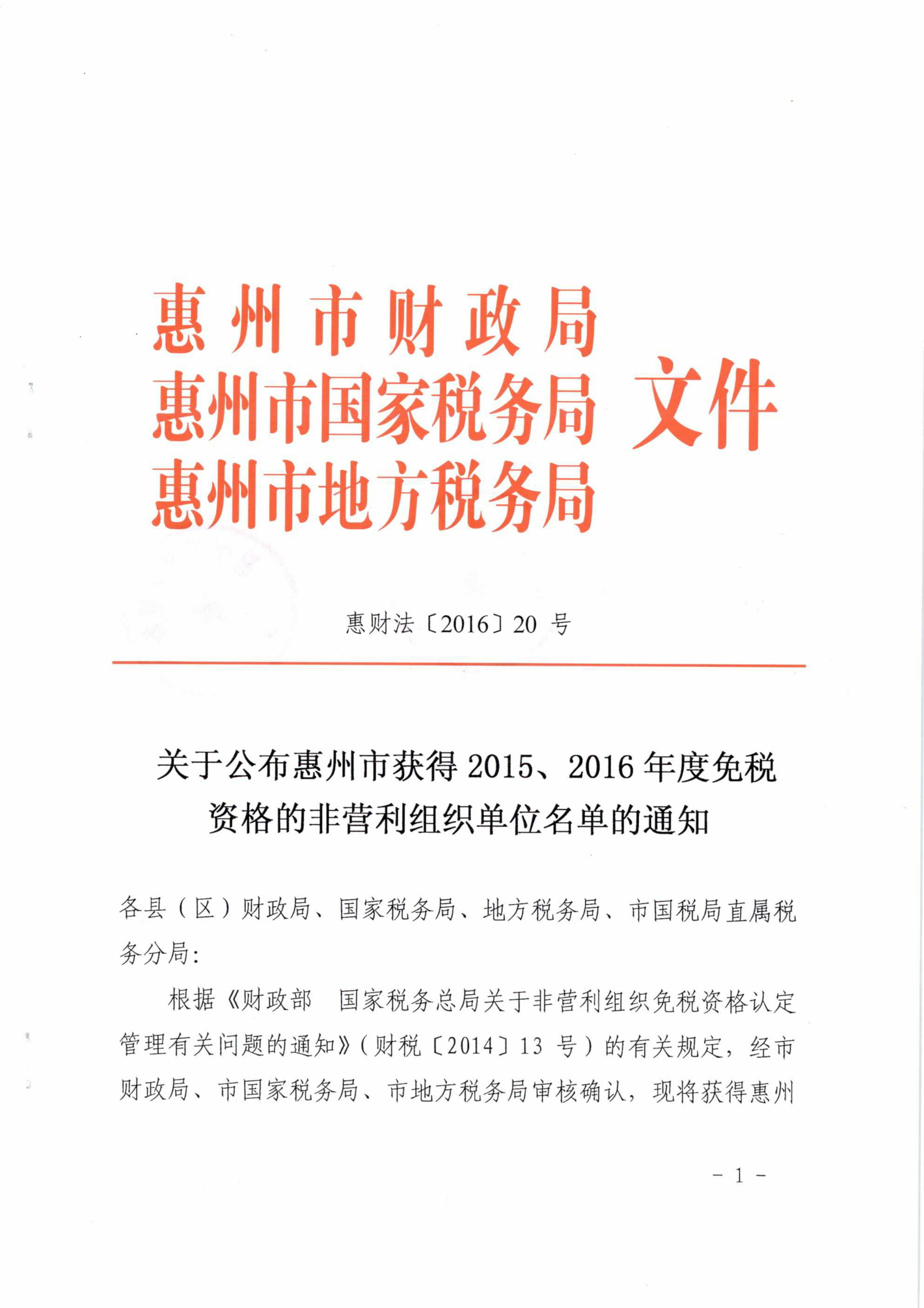 關于公布惠州市獲得2015、2016年度免稅資格的非營利組織單位名單的通知