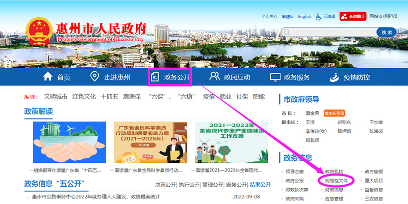 政府信息主要包括 "走進惠州"、"政務公開"、"政民互動"、"政務服務"四大版塊,可以從網站導航欄進入該頁面,或用以下快捷方式獲取政府信息: