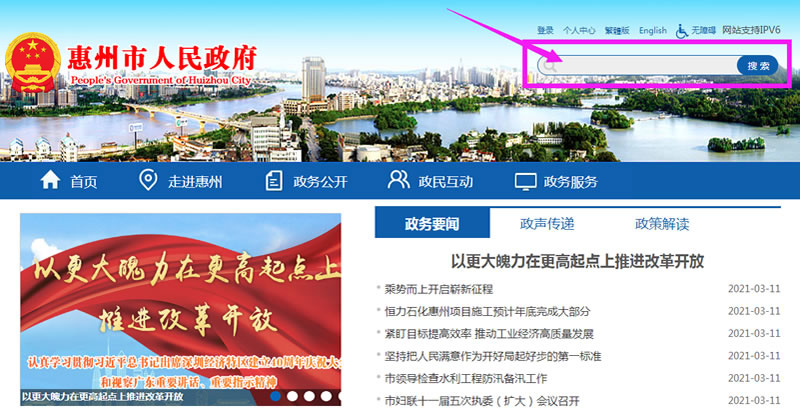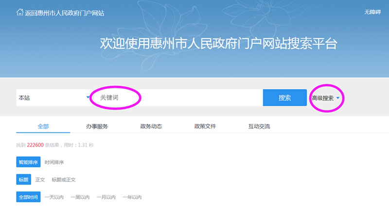 通過站內搜索,輸入關鍵詞,可以查找站內涵蓋"走進惠州"、"政務公開"、"政民互動"、"政務服務"四大板塊的相關信息。