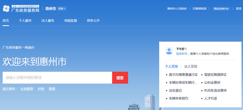 點擊網站導航欄"政務服務"窗口,進入"廣東省政務服務網"惠州分廳,可根據需求選擇"個人服務"、"法人服務"查找服務事項: