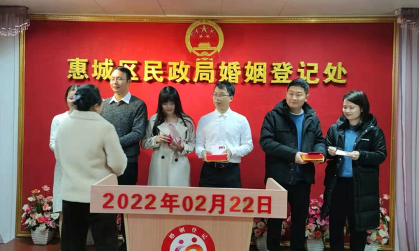 2022年2月22日,來到惠城區(qū)婚姻登記處登記的一對(duì)新人合照。