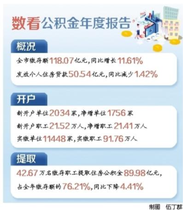 根據(jù)《報(bào)告》,全市2021年住房公積金新開戶單位2034家,凈增單位1756家,新開戶職工21.52萬人,凈增職工21.41萬人;實(shí)繳單位11448家,實(shí)繳職工91.76萬人,繳存額118.07億元,分別同比增加18.12%、7.6%和11.61%。2021年末,繳存總額780.52億元,比上年末增加17.82%;繳存余額238.18億元,同比增加13.37%。