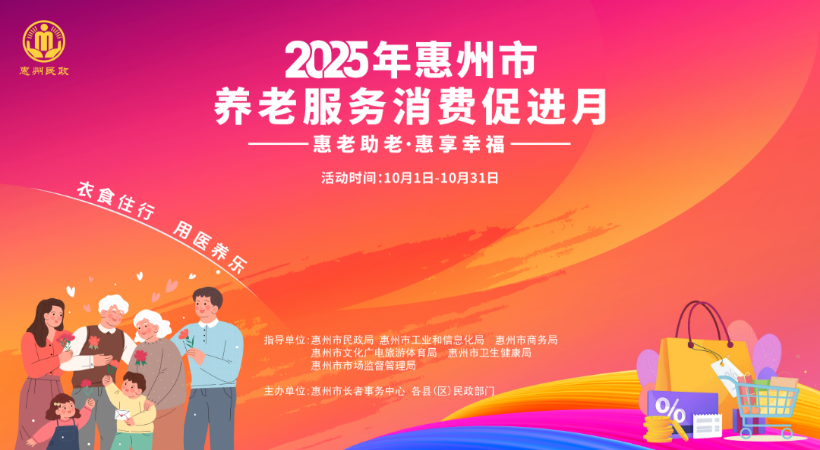今年10月是全國首個“養(yǎng)老服務(wù)消費促進月”。由惠州市民政局、惠州市工業(yè)和信息化局、惠州市商務(wù)局、惠州市文化廣電旅游體育局、惠州市衛(wèi)生健康局、惠州市市場監(jiān)督管理局指導(dǎo),惠州市長者事務(wù)中心、各縣(區(qū))民政部門主辦的惠州市首屆“養(yǎng)老服務(wù)消費促進月”活動將于10月1日正式啟幕。從10月1日到31日,全市800家商家(機構(gòu))共同為全市老年朋友獻上專屬的“幸福禮包”,歡度首個長者專屬購物節(jié)!優(yōu)惠覆蓋“衣、食、住、行、用、醫(yī)、養(yǎng)、樂”八大生活場景,無論您是惠州本地戶籍,還是在惠常住、來惠游玩的長者,都能共享這份好禮!