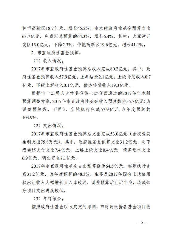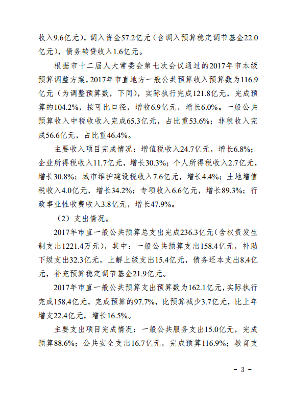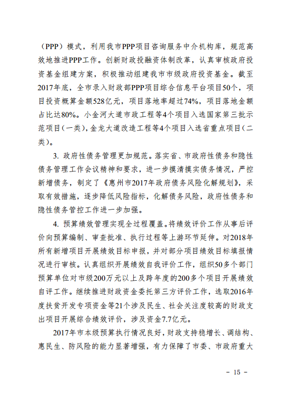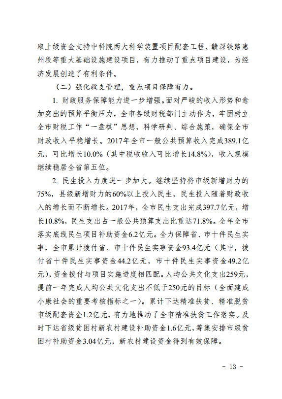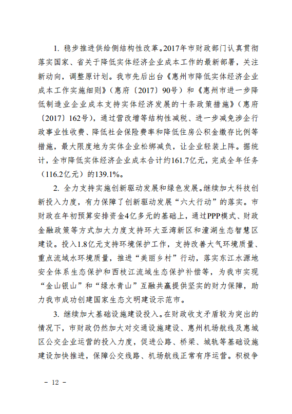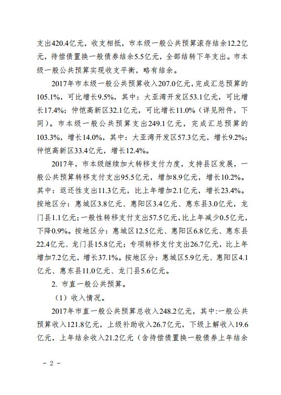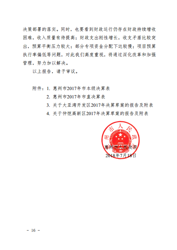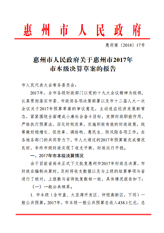附件:惠州市人民政府關于惠州市2017年市本級決算草案的報告