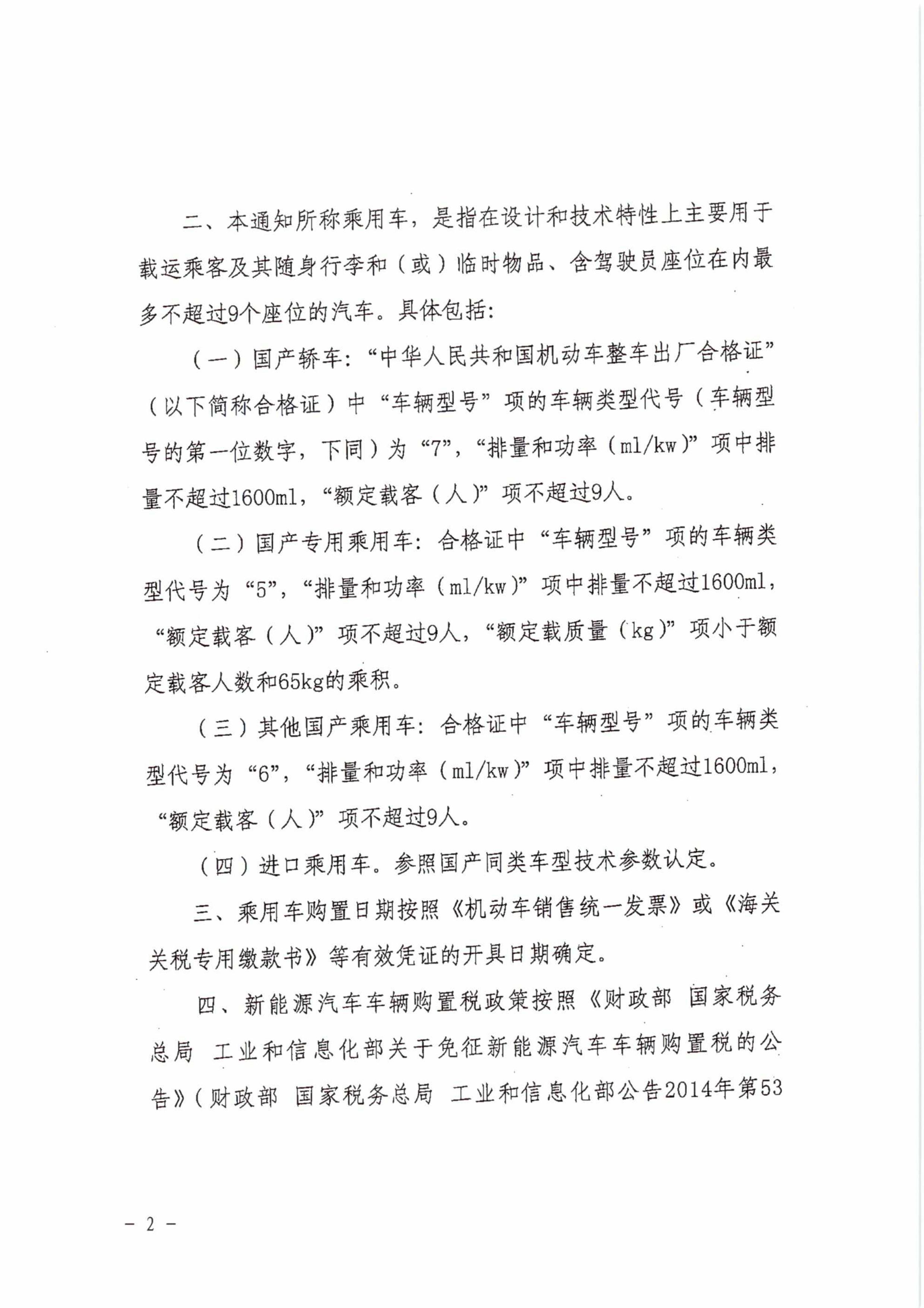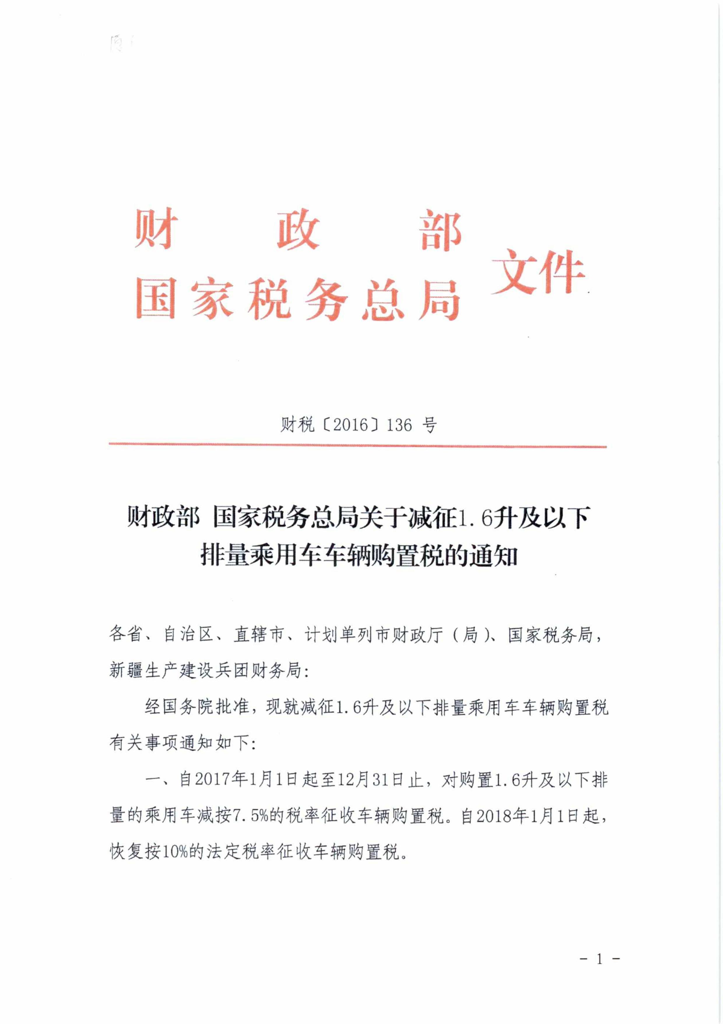 財政部 國家稅務總局關于減征1.6升及以下排量乘用車車輛購置稅的通知