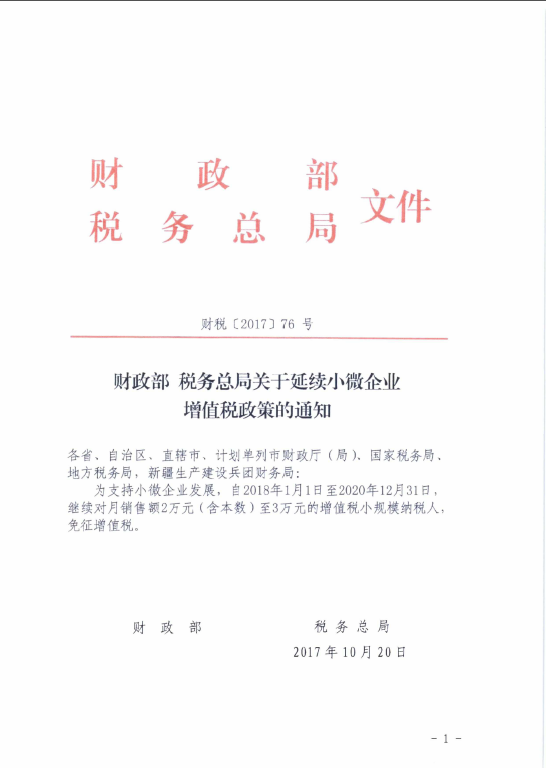財政部 稅務總局關于延續小微企業增值稅政策的通知