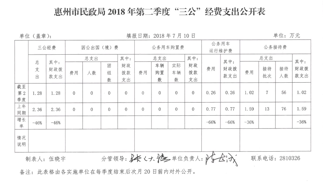惠州市民政局2018年第二季度“三公”經費支出公開表