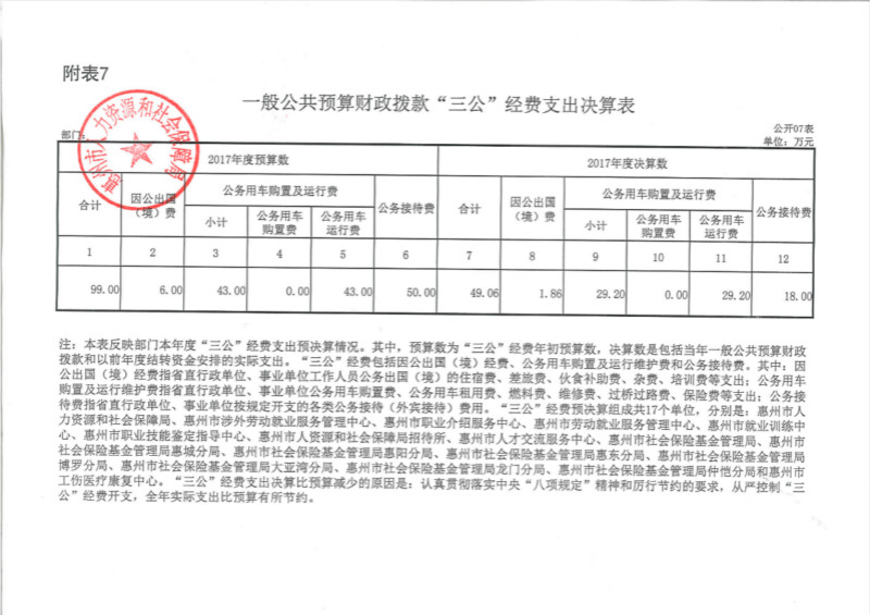 惠州市人力資源和社會保障局2017年一般公共預算財政撥款“三公”經費支出決算表