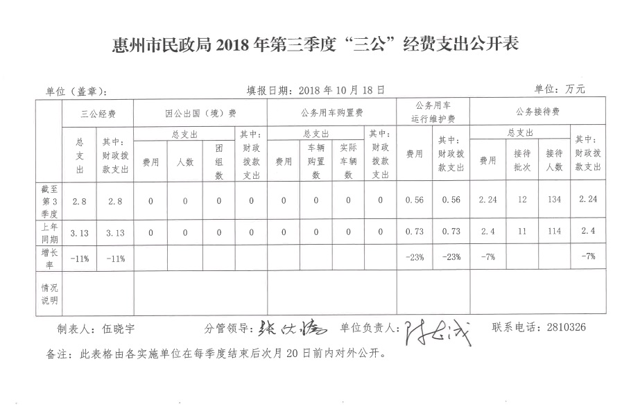 惠州市民政局2018年第三季度“三公”經費支出公開表