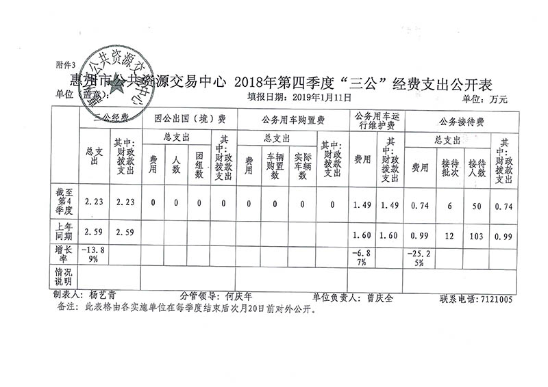 惠州市公共資源交易中心2018年第四季度“三公”經(jīng)費支出公開表
