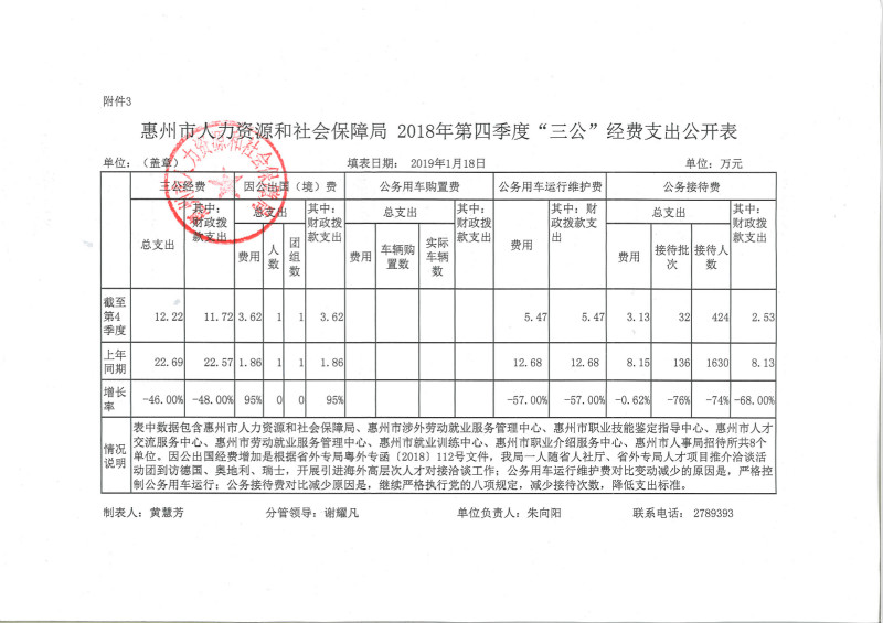 惠州市人力資源和社會保障局2018年第四季度“三公”經費支出公開表