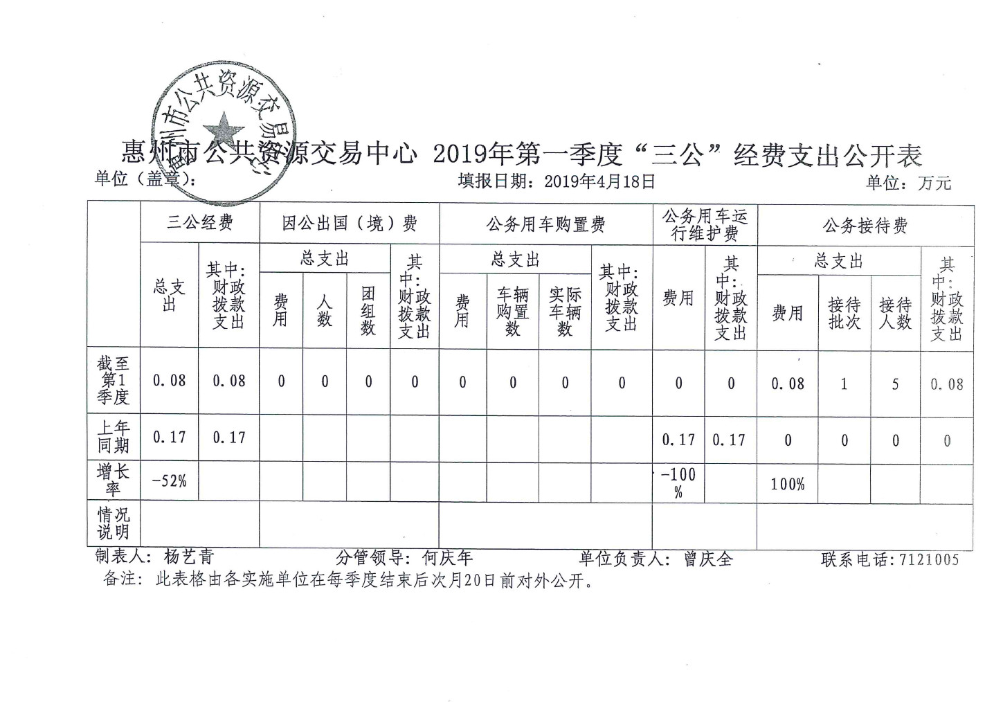 惠州市公共資源交易中心2019年第一季度“三公”經費支出公開表