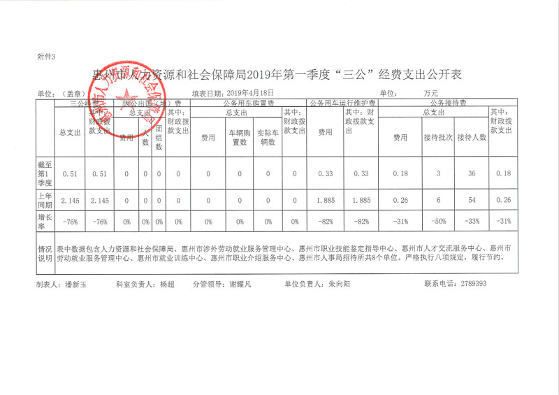 惠州市人力資源和社會保障局2019年第一季度“三公”經費支出公開表