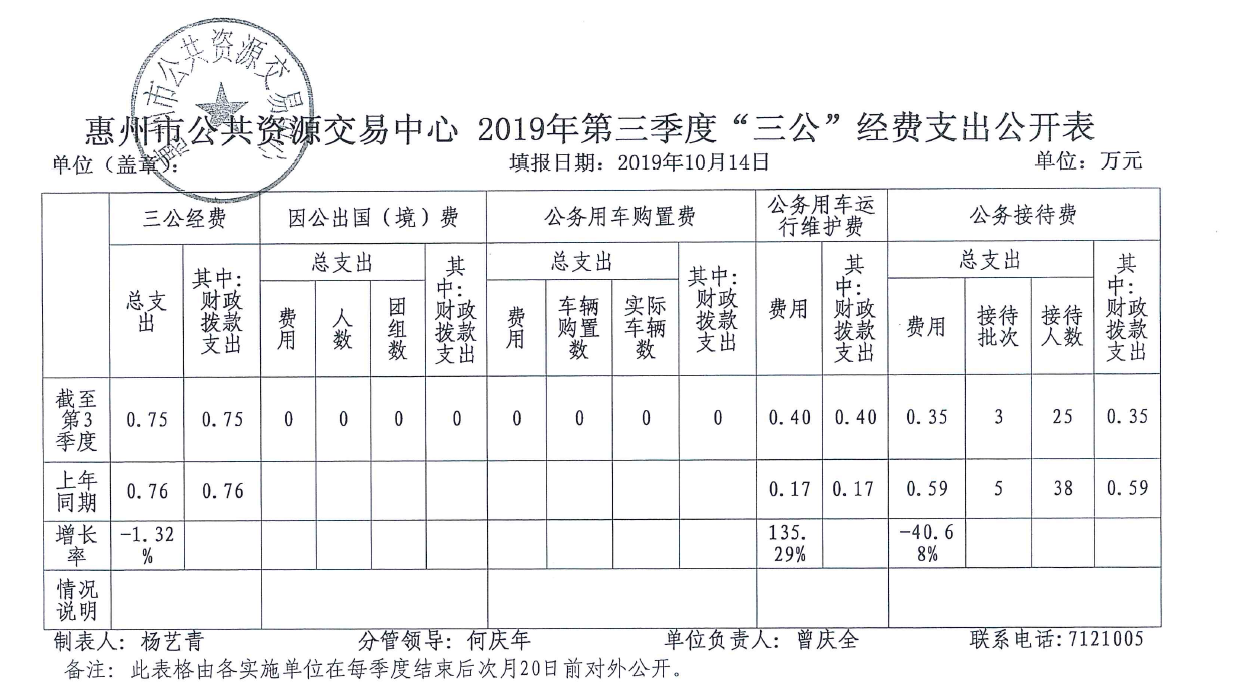 惠州市公共資源交易中心2019年第三季度“三公”經費支出公開表