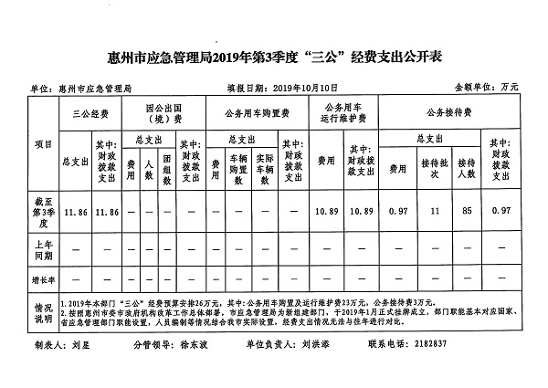 惠州市應急管理局2019年第3季度“三公”經費支出公開表