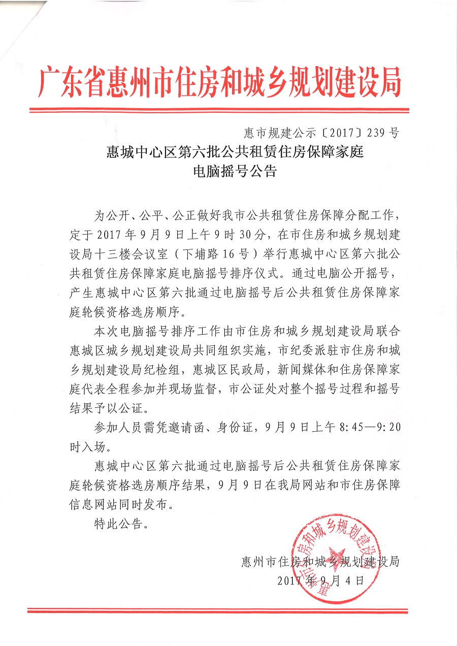 惠城中心區第六批公告租賃住房保障家庭電腦搖號公告