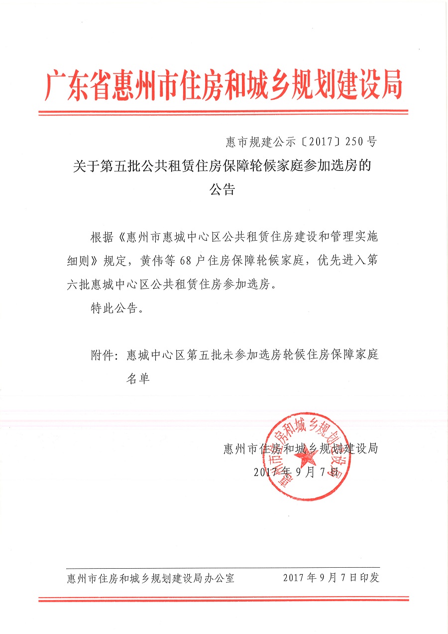 惠城中心區第五批未參加選房輪候住房保障家庭名單