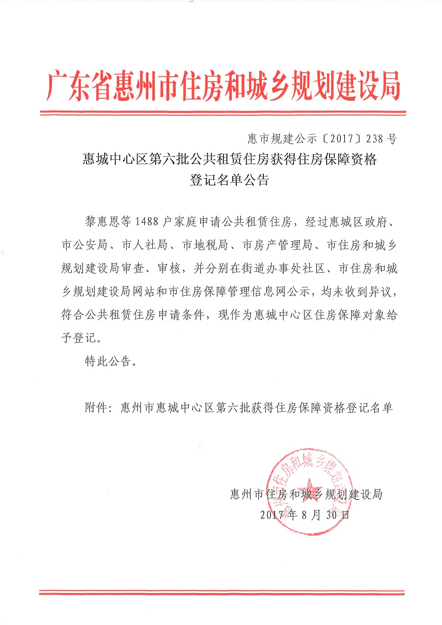 惠城中心區第六批公共租賃住房獲得住房保障資格登記名單公告