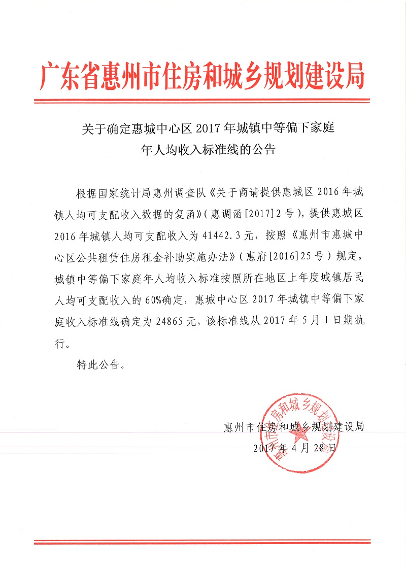 關于確定惠城中心區2017年城鎮中等偏下家庭年人均收入標準線的公告