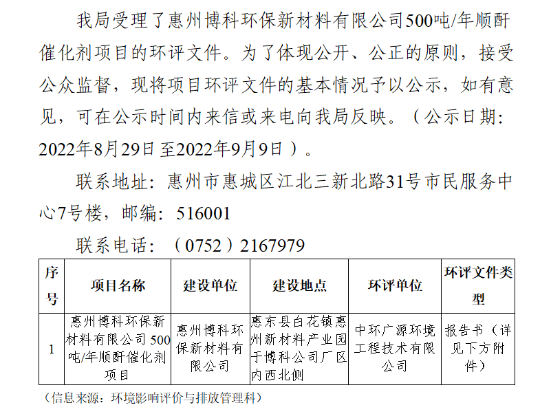 建設項目受理信息公示(惠州博科環保新材料有限公司500噸/年順酐催化劑項目)