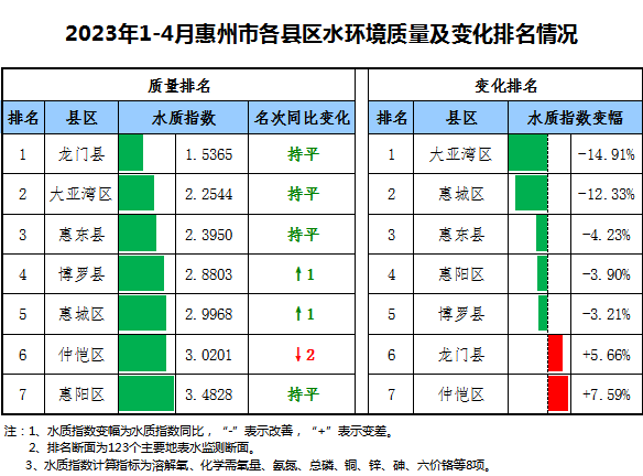 2023年1-4月,根據水質指數排名,水環境質量由好到差依次排名為龍門縣、大亞灣區、惠東縣、博羅縣、惠城區、仲愷區、惠陽區。與2022年同期相比,大亞灣區、惠城區、惠東縣、惠陽區、博羅縣等5個縣區水環境質量有所改善,仲愷區、龍門縣等2個縣區水環境質量有所下降。