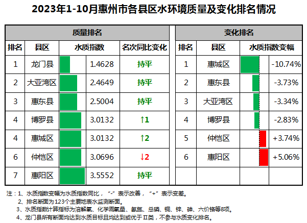 2023年1-10月,根據水質指數排名,水環境質量由好到差依次排名為龍門縣、大亞灣區、惠東縣、博羅縣和惠城區、仲愷區、惠陽區。與2022年同期相比,惠城區、惠東縣、大亞灣區、博羅縣等4個縣區水環境質量有所改善,惠陽區、仲愷區水環境質量有所下降。