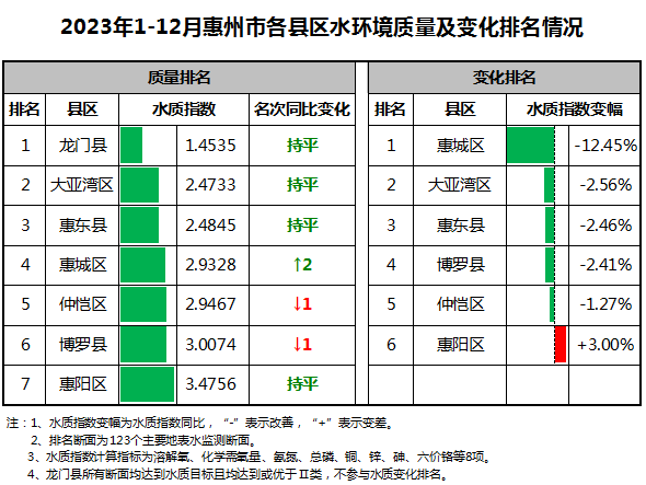 2023年1-12月,縣級以上在用集中式飲用水水源(8個)水質(zhì)達標率為100%。 2023年1-12月,惠州市納入 “十四五”國家地表水環(huán)境質(zhì)量監(jiān)測網(wǎng)的11個國控斷面水質(zhì)優(yōu)良率100%,劣Ⅴ類比例為0%。 2023年1-12月,根據(jù)水質(zhì)指數(shù)排名,水環(huán)境質(zhì)量由好到差依次排名為龍門縣、大亞灣區(qū)、惠東縣、惠城區(qū)、仲愷區(qū)、博羅縣、惠陽區(qū)。與2022年同期相比,惠城區(qū)、大亞灣區(qū)、惠東縣、博羅縣、仲愷區(qū)等5個縣區(qū)水環(huán)境質(zhì)量有所改善,惠陽區(qū)水環(huán)境質(zhì)量有所下降。