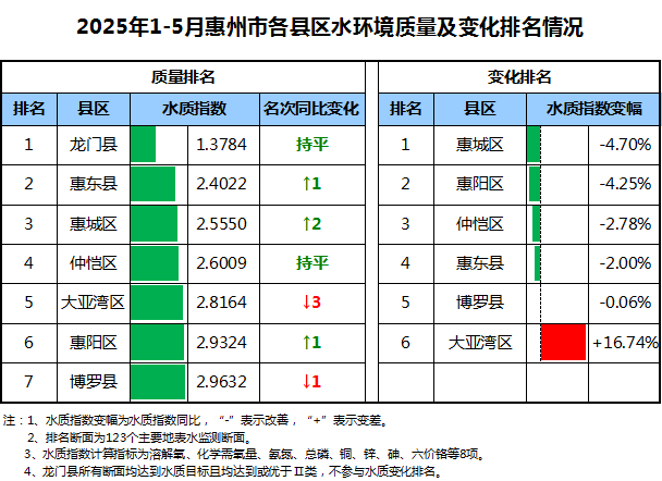 2025年1-5月惠州市水環(huán)境質(zhì)量及變化排名情況