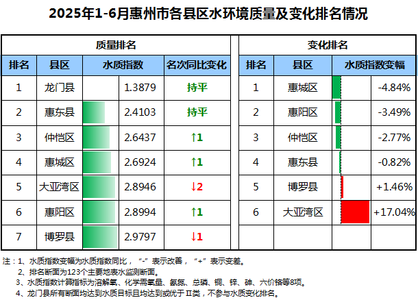 “十四五”國家地表水環(huán)境質(zhì)量監(jiān)測網(wǎng)的11個國控斷面水質(zhì)優(yōu)良率(Ⅰ-Ⅲ類)100%,劣Ⅴ類比例為0%。 縣區(qū)排名:2025年1-6月,根據(jù)水質(zhì)指數(shù)排名,水環(huán)境質(zhì)量由好到差依次排名為龍門縣、惠東縣、仲愷區(qū)、惠城區(qū)、大亞灣區(qū)、惠陽區(qū)、博羅縣。與2024年同期相比,惠城區(qū)、惠陽區(qū)、仲愷區(qū)、惠東縣等4個縣區(qū)水環(huán)境質(zhì)量有所改善,大亞灣區(qū)和博羅縣水環(huán)境質(zhì)量有所下降。