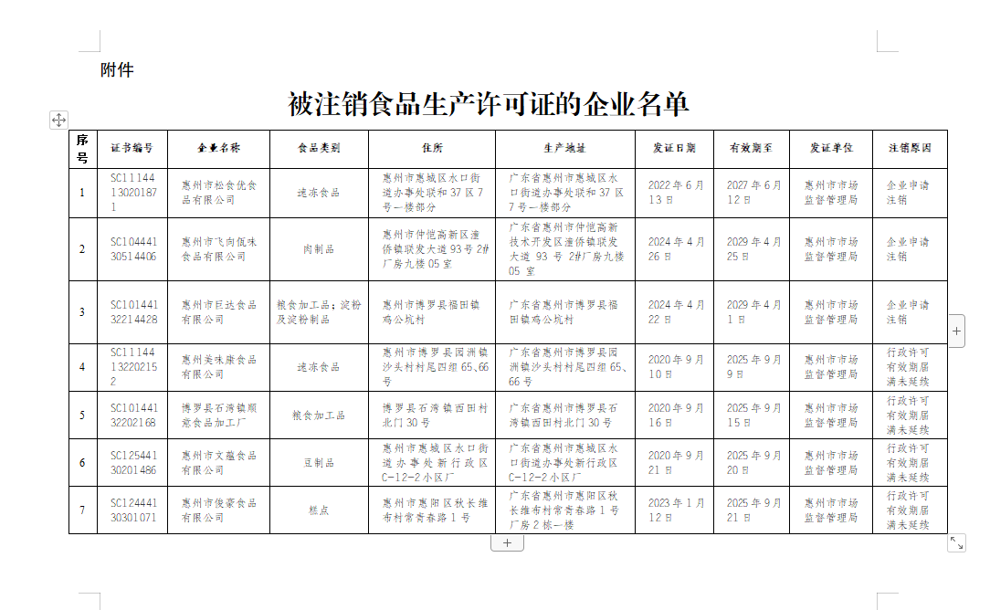 根據《中華人民共和國行政許可法》第七十條及《市場監督管理行政許可程序暫行規定》(國家市場監督管理總局令第16號)第四十八條、四十九條,因企業申請注銷及企業行政許可有效期屆滿未延續,我局決定注銷惠州美味康食品有限公司等七家企業的食品生產許可證(具體名單見附件)。被注銷的證書和許可證編號不得使用。