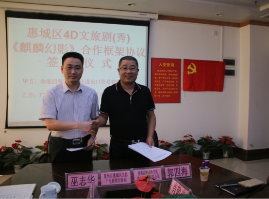 經(jīng)過(guò)多輪洽談協(xié)商及邀請(qǐng)國(guó)內(nèi)外有名氣的舞臺(tái)藝術(shù)策劃專(zhuān)家團(tuán)隊(duì)的考察和采風(fēng),惠城區(qū)文廣新局與香港四海對(duì)外文化進(jìn)出口貿(mào)易有限公司達(dá)成合作意向,并于8月29日下午在區(qū)文廣新局450會(huì)議室舉行了惠城區(qū)4D文旅劇(秀)《麒麟幻影》(暫名)合作框架協(xié)議簽訂儀式,區(qū)文廣新局巫志華局長(zhǎng)與香港四海對(duì)外文化進(jìn)出口貿(mào)易有限公司負(fù)責(zé)人郭四海簽定了合作框架協(xié)議書(shū),區(qū)文廣新局全體班子成員及各股室(隊(duì))負(fù)責(zé)人、香港四海對(duì)外文化進(jìn)出口貿(mào)易有限公司梁麗青等一并見(jiàn)證了簽約儀式。