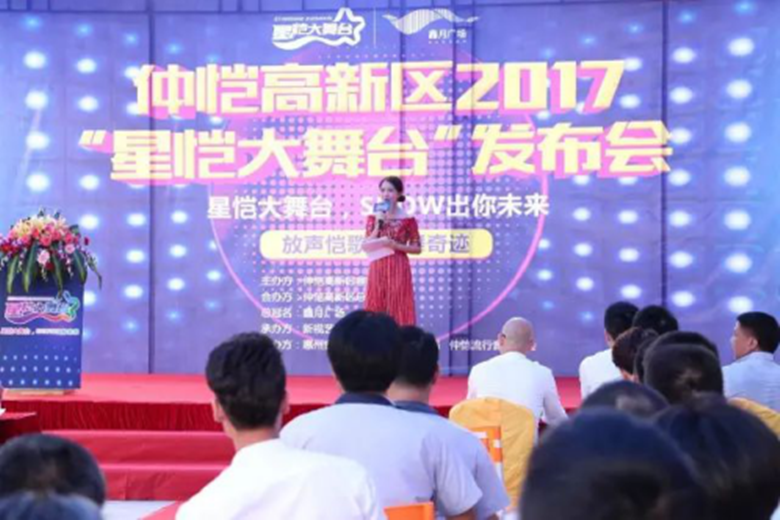 2017年8月7日下午,仲愷高新區“星愷大舞臺”賽事啟動儀式在鑫月廣場營銷中心廣場舉行。本屆歌舞賽事由仲愷高新區宣教文衛辦主辦,仲愷高新區總工會合辦,鑫月廣場總冠名,新視藝傳媒集團承辦,惠州音樂世家、惠州邱路舞蹈、仲愷流行音樂協會共同協辦。