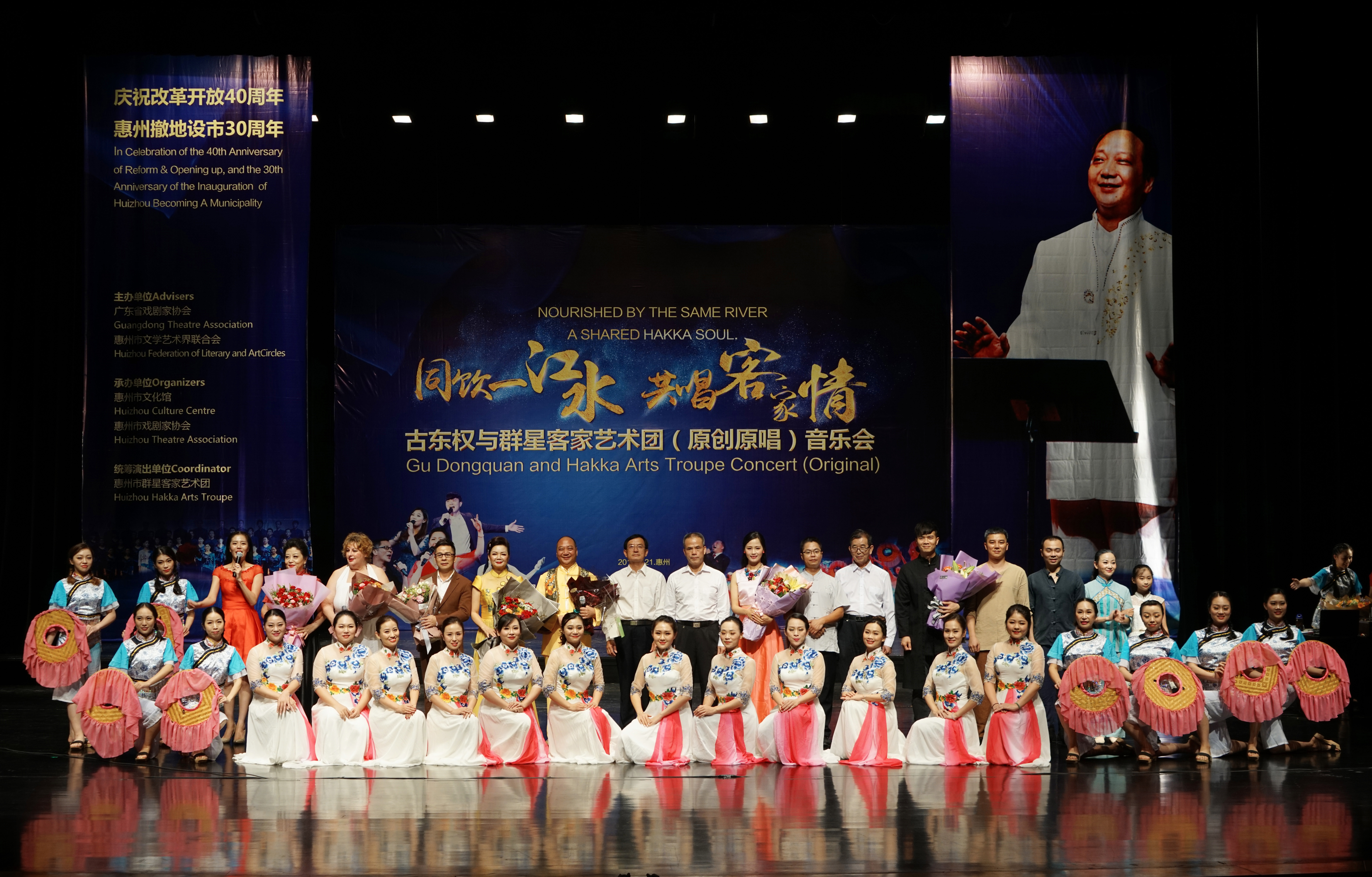 七月流火,大地飛歌,殷殷客家情,長長東江河。慶祝我國改革開放40周年和惠州撤地設市30周年之際,7月21日晚,由廣東省戲劇家協會、惠州市文學藝術界聯合會主辦,惠州市文化館、惠州市戲劇家協會承辦,惠州市群星客家藝術團統籌演出的“同飲一江水,共唱客家情”古東權與群星客家藝術團音樂會在惠州文化藝術中心歌劇院隆重舉行。為惠州市民及慕名遠來的音樂發燒友們帶了一場表演形式豐富、精彩絕倫的聽覺饗宴。惠州市文聯主席安想珍,原廣東省音樂家協會秘書長、著名美籍華裔作曲家陳淳彥,香港著名音樂家易有伍,馬來西亞馬六甲惠州會館彭順會長等相關領導和嘉賓出席并觀看了演出。