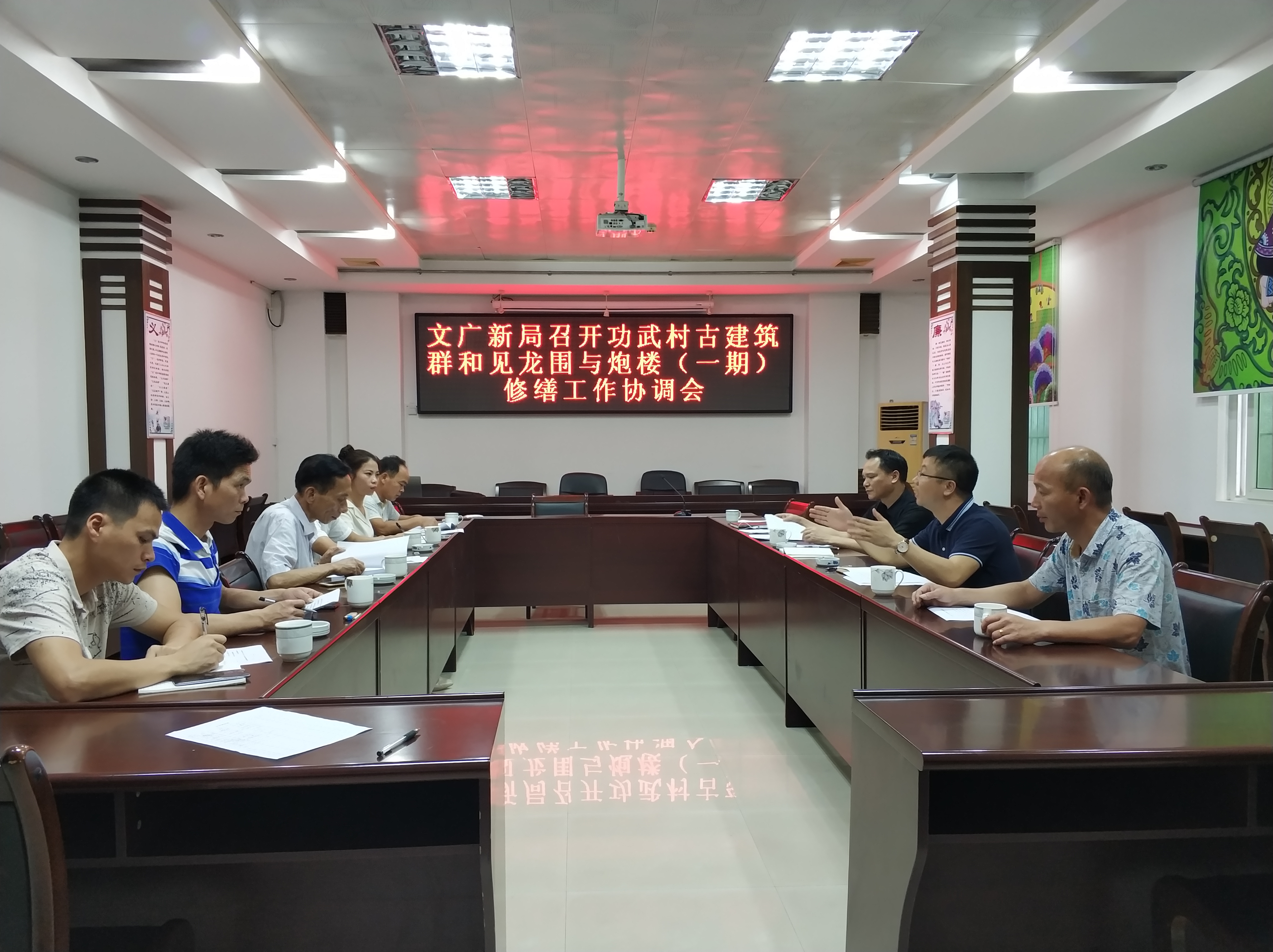 2018年5月29日,龍門縣文廣新局在龍門縣博物館四樓會(huì)議室召開功武村古建筑群、見龍圍與炮樓(一期)修繕工作協(xié)調(diào)會(huì)。龍門縣文廣新局、龍門縣博物館、地派鎮(zhèn)政府、渡頭村委、龍華鎮(zhèn)政府、功武村委的相關(guān)負(fù)責(zé)人參加了協(xié)調(diào)會(huì)。會(huì)上,各方就功武村古建筑群、見龍圍與炮樓(一期)修繕內(nèi)容展開了討論和協(xié)調(diào)。龍門縣文廣新局要求地派鎮(zhèn)政府、龍華鎮(zhèn)政府和相關(guān)村委會(huì)做好村民的溝通工作,保證修繕工程能按計(jì)劃進(jìn)行。