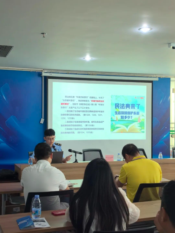 惠州市生態環境局惠陽分局工作人員著重從《中華人民共和國民法典》的基本原則、基本要求、主要內容、主要亮點等方面進行詳細講解,用通俗易懂的語言和貼近生活實際的案例闡述,深入剖析了《中華人民共和國民法典》中物權、合同和侵權責任等方面的企業熱點問題,同時結合生態領域工作,重點對《中華人民共和國民法典》侵權責任章節中規定的生態損害懲罰性賠償制度進行了解讀,具有很強的針對性和指導性。