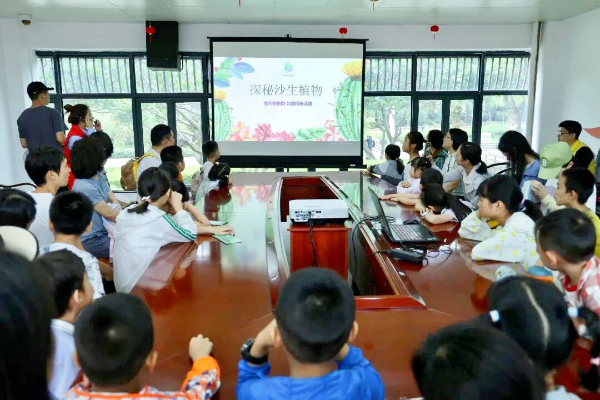 活動分為三個環節。首先,為參加活動的家長和小朋友安排了一場生動的生物多樣性知識講座,生態環境講解員介紹了生物多樣性的概念,并以沙棘、梭梭、胡楊等沙生植物為例,進一步詳細地介紹沙生植物的生長習性和形態特征及其在生態系統中扮演的角色。講座過程中,小朋友們認真傾聽,互動熱情高漲,積極參與問答。