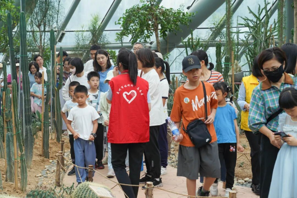 第二環節,小朋友們跟隨生態環境講解員和志愿者的腳步來到沙生館。實地觀察沙生植物“真面目”,講解員為家長和小朋友介紹了各種沙生植物名稱,小朋友對眼前那一棵棵形態不一,渾身長滿尖刺的植物表現出強烈的好奇心,甚至有些小朋友躍躍欲試地想上前觸摸,志愿者微笑著說“植物們很頑強也很脆弱,我們要小心呵護哦”。