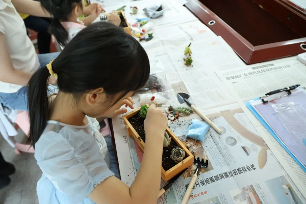 第三環節,參觀完沙生館,小朋友表示也想擁有屬于自己的沙生植物,正巧,這一環節就是手動DIY沙生盆栽。小朋友興奮地接過物料,馬上就緊鑼密鼓地動起手來,有些先給松松沙土,有些小心翼翼地把植物擺進木盆中,不一會兒小朋友就完成了自己的作品,臉上洋溢著自豪的笑容。