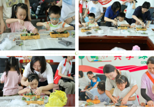在手工制作環節,小朋友們化身成一個個“小小園藝師”,在志愿者們的指引下,松土、栽種、精心裝飾多肉植物,制作一份屬于自己獨一無二的盆栽。