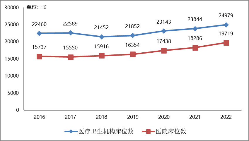 (二)醫療衛生機構床位數。截至2022年底,全市醫療衛生機構擁有住院床位24979張,其中:醫院19719張(內:民營醫院5795張), 衛生院2925張,婦幼保健機構1373張,??萍膊》乐螜C構289張,社區衛生服務機構644張,護理機構29張。與上年相比,床位總量增加1135張,增長4.76%。按照常住人口統計,全市每千人口床位數4.13張,較上年增加0.2張。  圖2