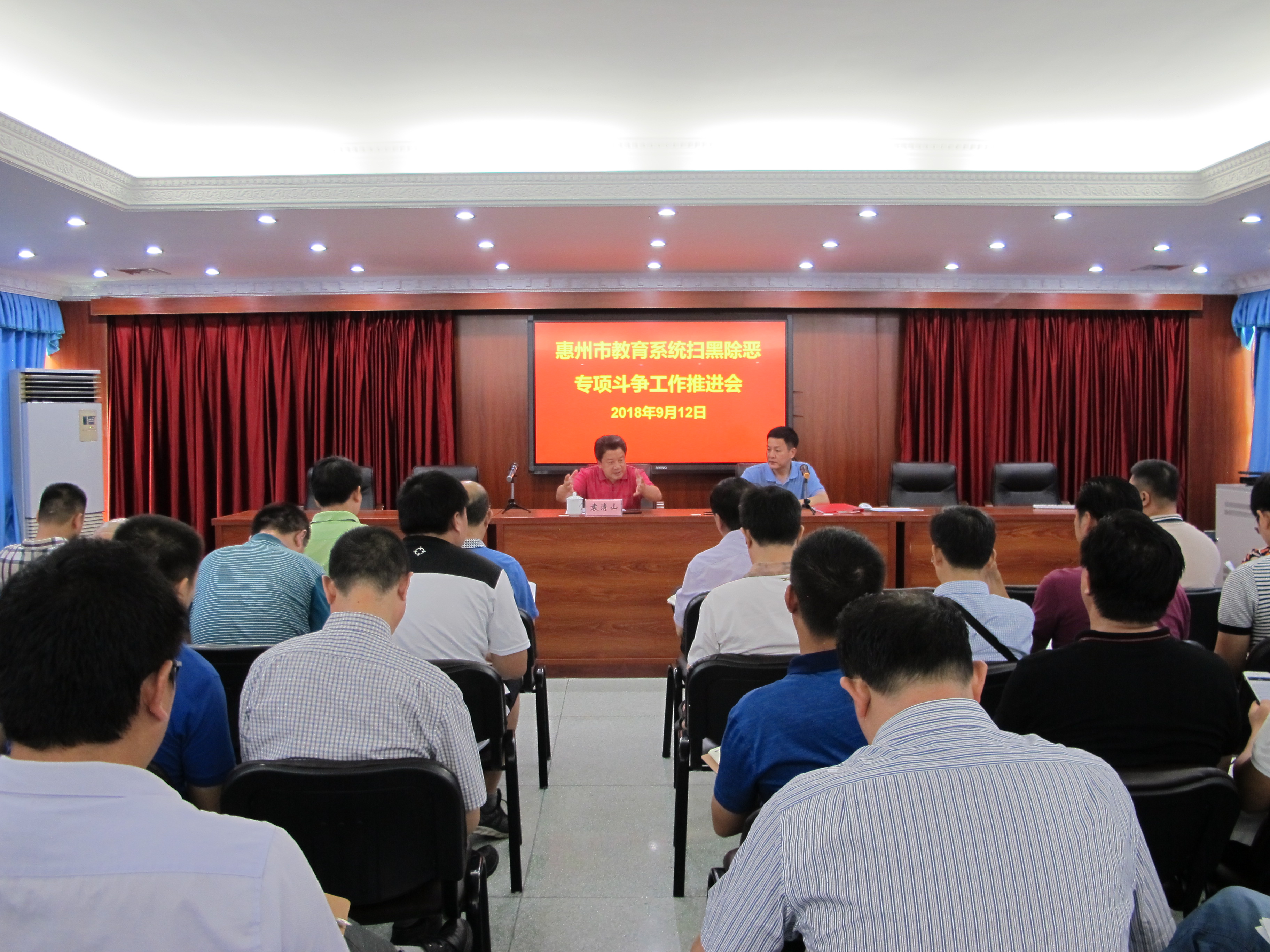為全面做好迎接中央督導組檢查工作,進一步推動全市教育系統掃黑除惡專項斗爭工作深入開展,按照省、市掃黑除惡辦工作部署和要求,市教育局于2018年9月12日上午在市教育局三樓會議室召開了全市掃黑除惡專項斗爭工作推進會,袁清山局長出席并講話,以及局機關安保科、人事科、大中專辦、德育科、服務大廳科室負責人、各縣(區)教育局分管副局長和安全辦主任、市直各學校分管副校長和和安全辦主任共70余人參加了會議。會議由楊炎林副局長主持。