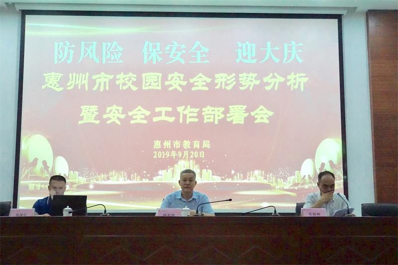 為進一步總結我市校園安全工作經驗,確保校園安全,深入分析當前學校安全形勢,部署下一階段特別是國慶期間學校的安全管理工作重點。9月20日,市教育局在光正實驗學校召開2019年安全形勢分析會暨安全工作部署會。市教育局楊炎林副局長出席了會議,各縣(區)教育局分管領導和安全辦主任、惠城區各學校負責人、市直學校分管副校長和安全辦主任、惠州人保、惠州平安、教保中聯、學優平臺、東江校車、心連心公益協會、平安之路等單位共計430余人參加了會議。