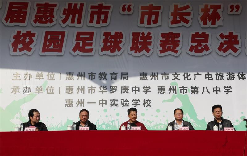 11月25日下午,第五屆惠州市“市長杯”青少年校園足球聯賽總決賽在市華羅庚中學圓滿落下帷幕。本屆賽事由市教育局、市文化廣電旅游體育局主辦,分三個場地:市華羅庚中學、市八中、市一中實驗學校舉行,市教育局黨組書記、局長袁清山出席了開幕式并為球賽開球。